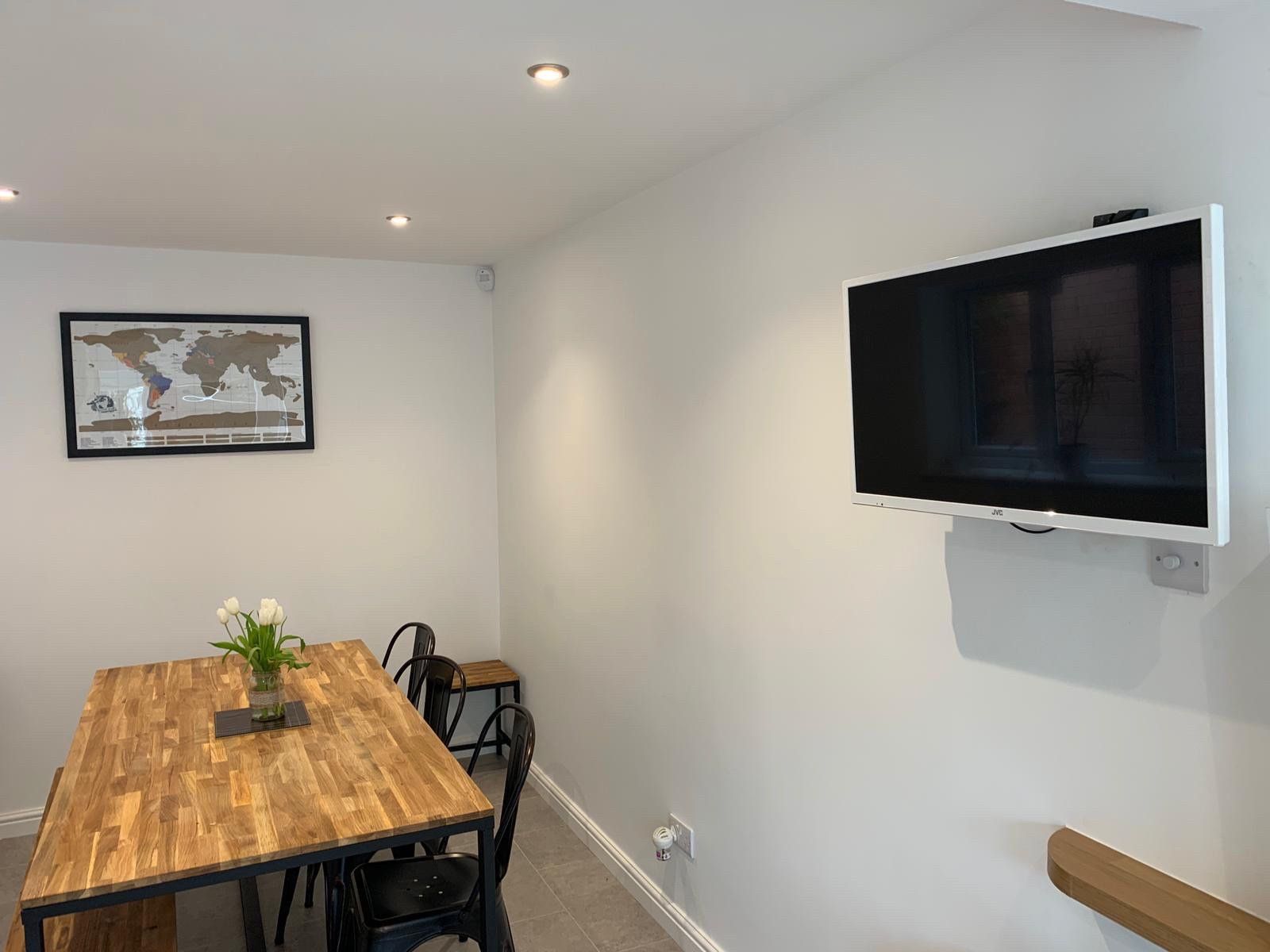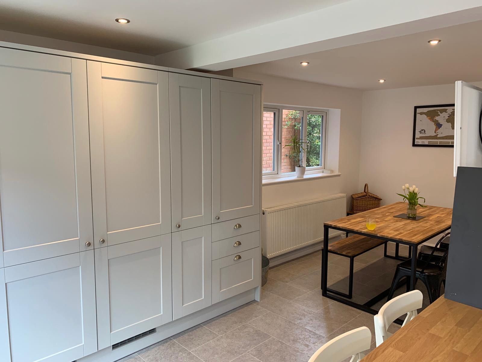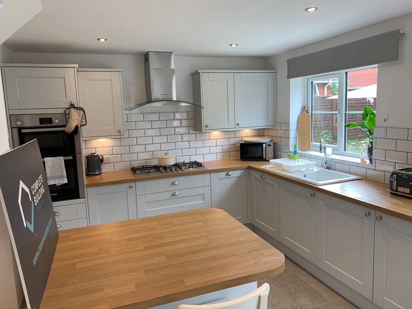 This was a garage conversion to create an open plan kitchen - dining room, and a small section at the front of the garage remained as storage so the front aspect of the house was unchanged.